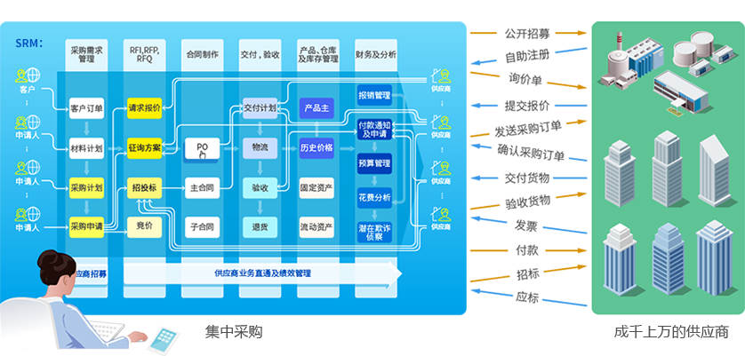 e 招采 SRMSRM 既可作為獨(dú)立的系統(tǒng),又可作為與 ERP 一起運(yùn)作的 e 招采系統(tǒng)。除了供應(yīng)商管理功能外,它支持多方實(shí)時(shí)的尋源、詢價(jià)、 競(jìng)價(jià)、招標(biāo)、訂單/合同、交收,入庫(kù)及付款的直通式處理。 更多直通式處理 隱藏 ↑ 展開(kāi) ↓